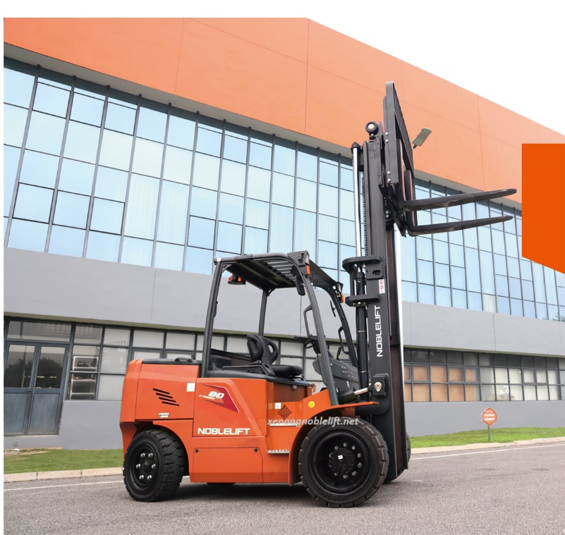 Xe nâng điện Noblelift 7 tấn FE4P70N Với động cơ bơm dầu công suất cao và bơm trục vít ít tiếng ồn, tốc độ nâng tăng vọt. Xe nâng 8 tấn hiện nâng toàn tải ở tốc độ 300 mm/giây.Thiết kế hợp lý với chiều dài cơ sở ngắn 2030mm và chiều rộng thân xe giảm đáng kể giúp tăng khả năng cơ động. Kết cấu nhẹ và điều khiển điện động cơ lái độc lập giúp giảm mức tiêu thụ năng lượng. Được trang bị cảm biến lái điều chỉnh tốc độ động cơ dựa trên vòng quay của vô lăng, giúp giảm mức tiêu thụ năng lượng và tiếng ồn của động cơ.